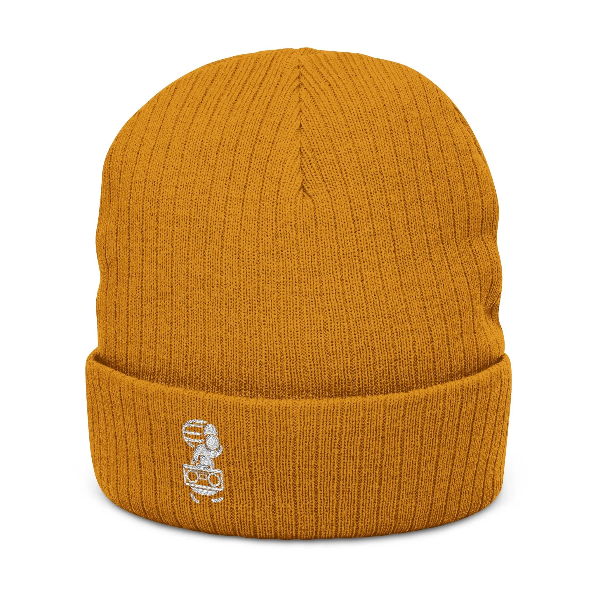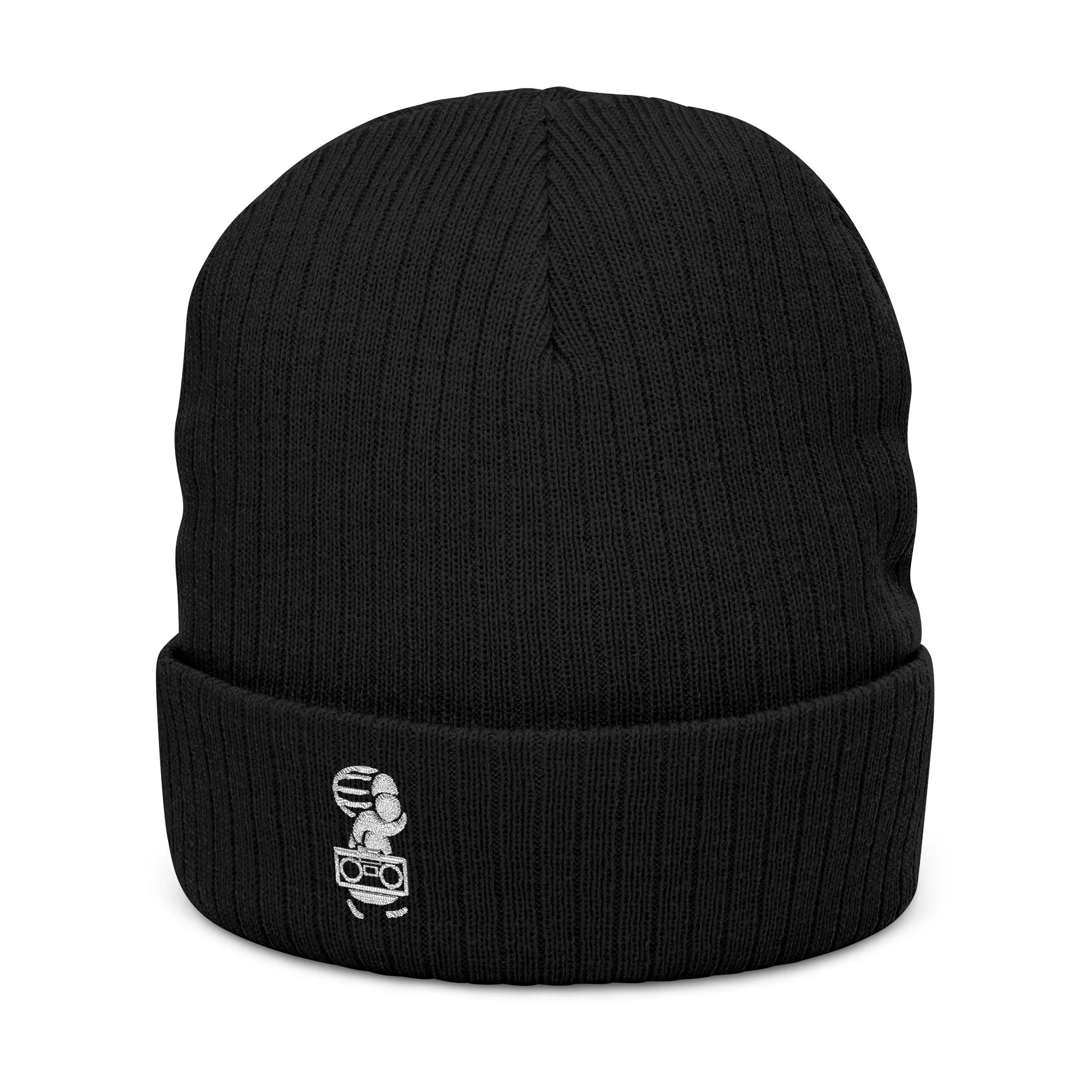 Embroidered beanie keeps it classy.